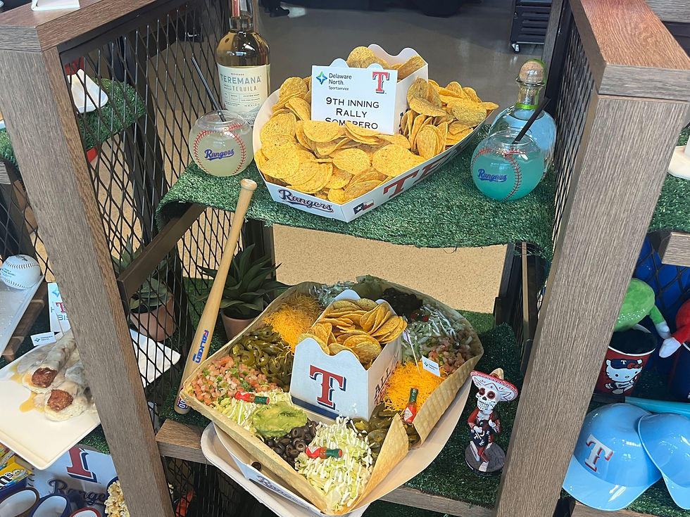 This year, they've introduced nachos you can wear in sombrero form, the 9th Inning Rally Sombrero: A Texas‑sized, nine‑layer dip served inside a 26‑inch fried tortilla shell, filled with refried beans, cheddar cheese, sour cream, guacamole, pico de gallo, black olives, jalapeños and shredded lettuce, served with tortilla chips.
